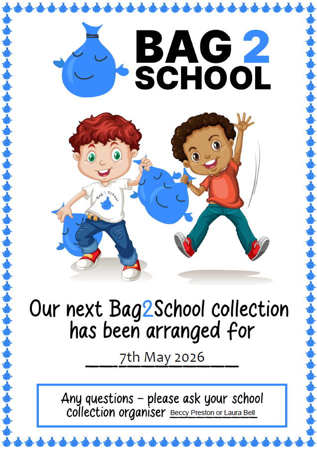 Please bag up any unwanted clothes, paired shoes, handbags, hats, bags, scarves, ties, bras, jewellery, socks or belts and leave them just inside the gate to the junior playground. Bag 2 school weigh the items and the more weight in total the more money we raise for the school. Thank you for your ongoing support.